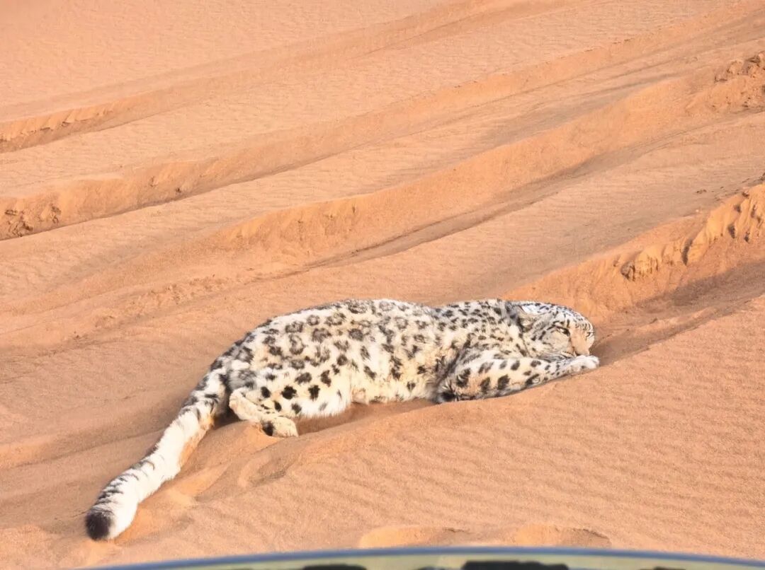 3月21日14时许,鄯善县公安局环境资源和食品药品犯罪侦查大队接到群众紧急报警,称在库木塔格沙漠海市蜃楼景点向沙漠纵深30公里处发现一只雪豹,疑似因误入沙漠陷入困境,急需救助。接警后,警方立即启动应急处置预案,由环食药侦大队牵头,迅速联动辟展派出所、特警大队警力组成救援专班,第一时间赶赴现场开展救援。