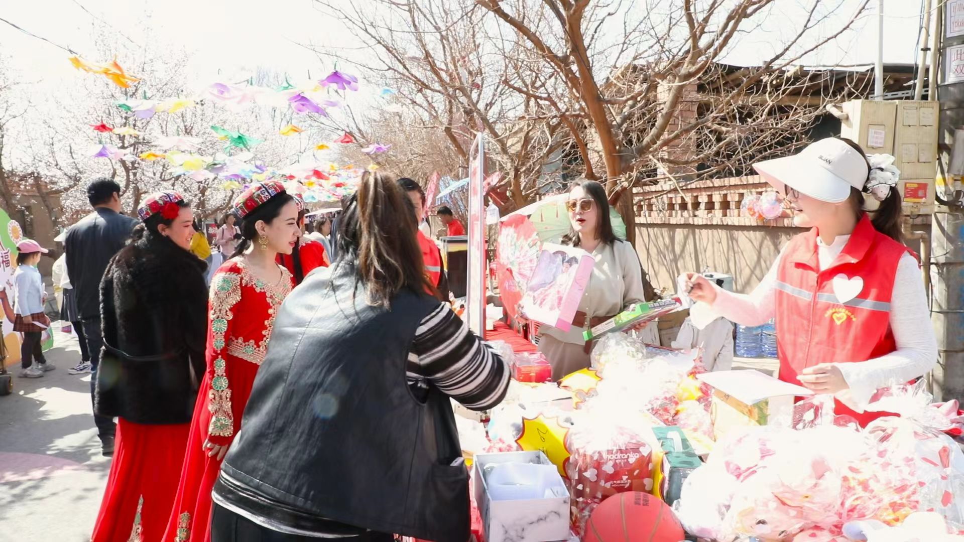 杏花烂漫处,爱心暖人心。连日来,托克逊县夏镇南湖村坎儿井巷人头攒动,一个特殊的摊位在花影中格外醒目——琳琅满目的衣物、生活用品整齐陈列,摊前的“爱心公益拍区”标识牌引人驻足。这是托克逊镇党员干部自发捐赠的650余件爱心物资,在杏花季期间设点销售,所得款项将全部用于帮扶辖区困难群众。