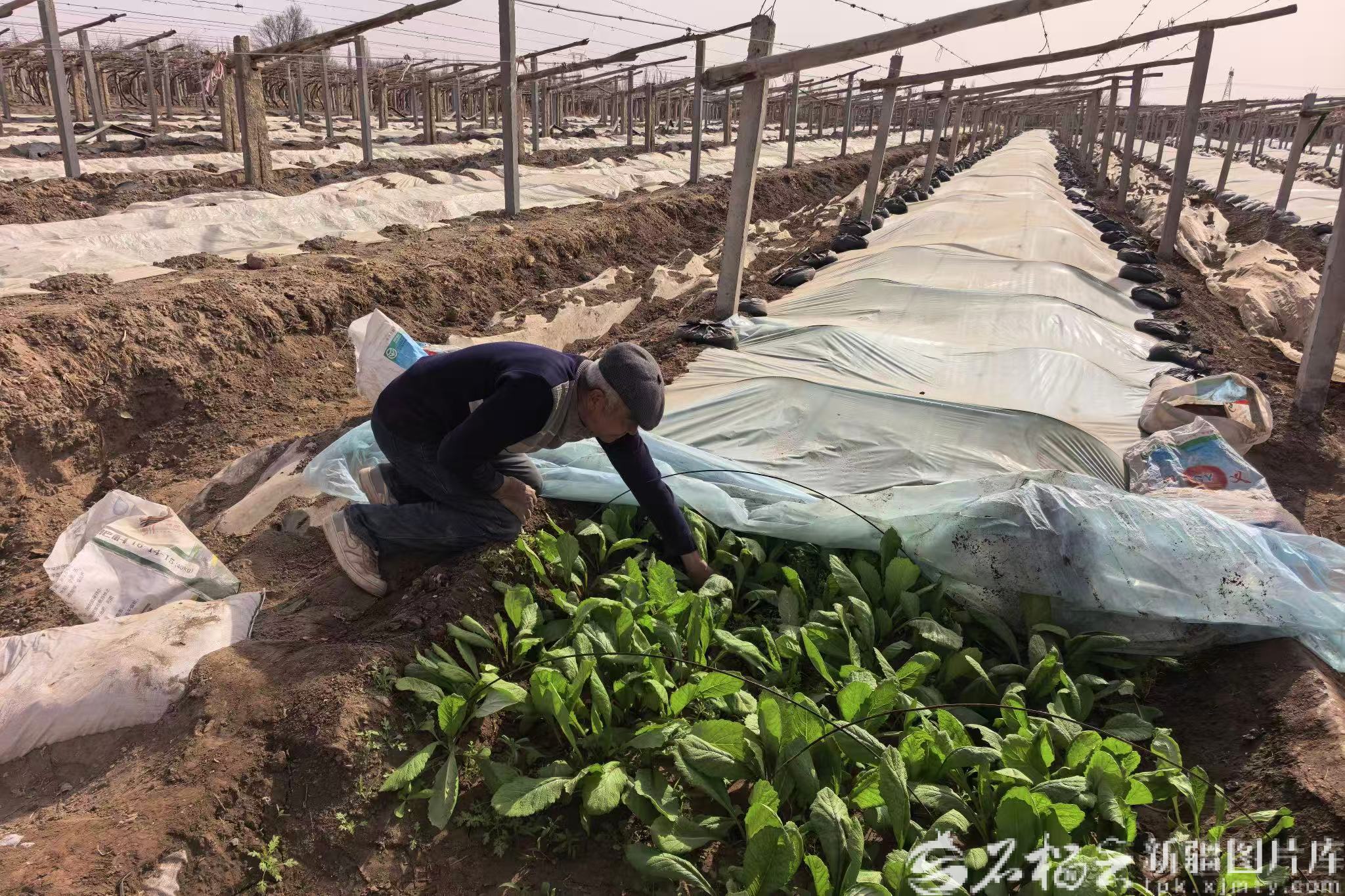 3月26日,吐鲁番市高昌区亚尔镇夏勒克村的葡萄田里,一排排规整的葡萄架下,嫩绿的蔬菜苗破土而出,长势喜人。村民亚库甫・克依木蹲在地头,指尖轻拂菜叶,仔细查看自家葡萄架下套种的蔬菜长势。