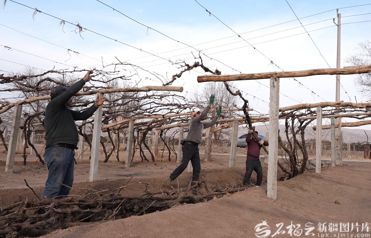 近日,吐鲁番市高昌区三堡乡种植户将沉睡一冬的葡萄藤搭上藤架。阿地力·阿力米提 摄