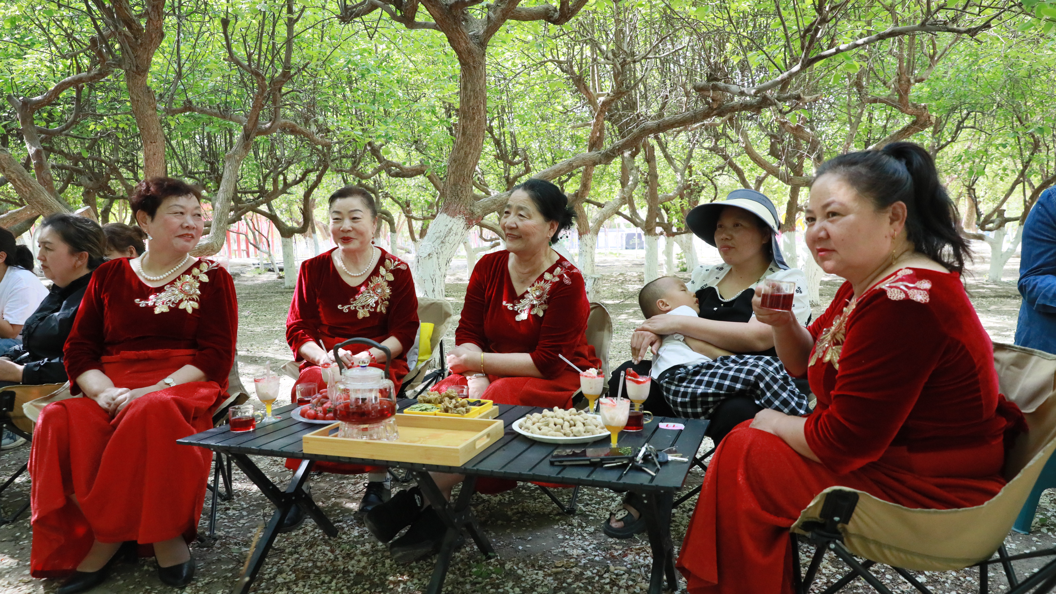 2026年4月10日参与“极致下午茶”活动的妇女在品桑葚茶。托克逊县融媒体中心 热依拉·热西提摄