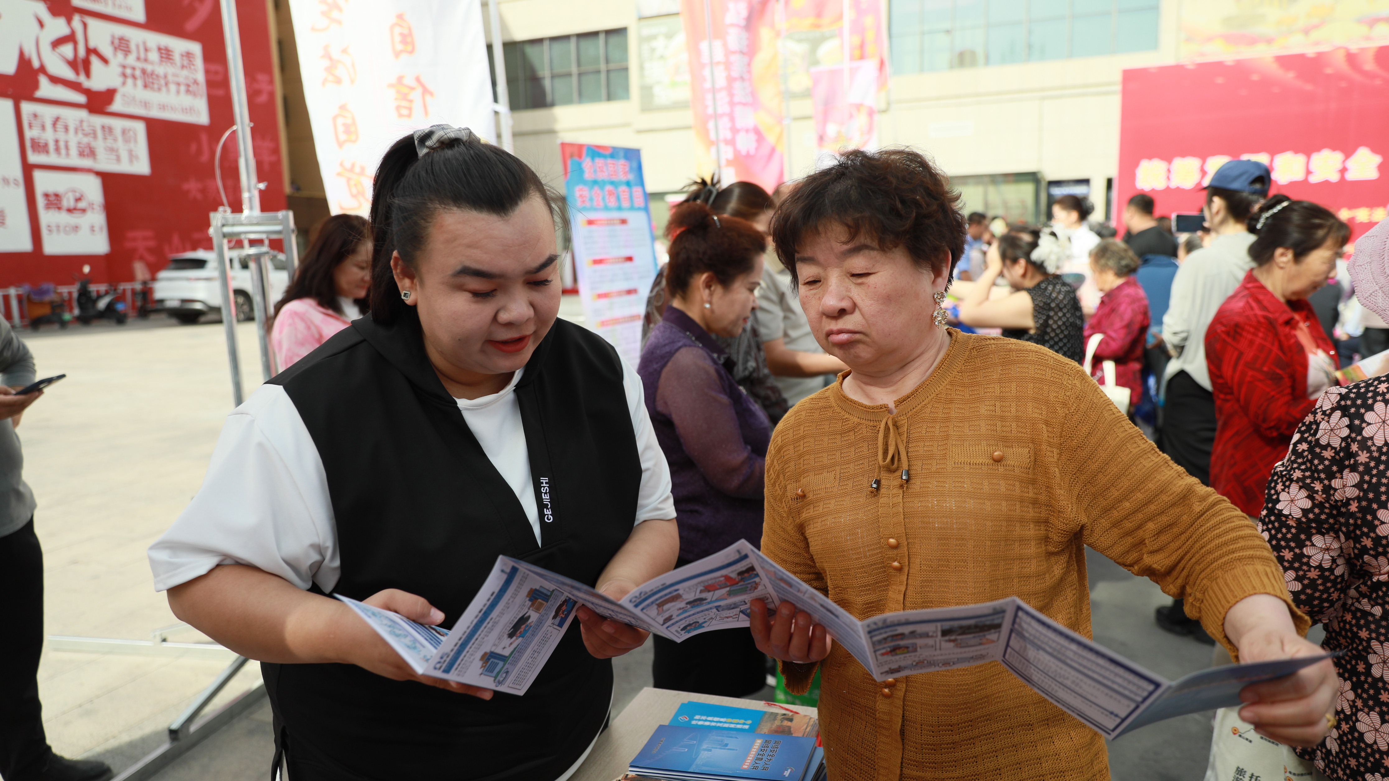 2026年4月15日,图为现场工作人员正在为过往群众宣讲法律知识。