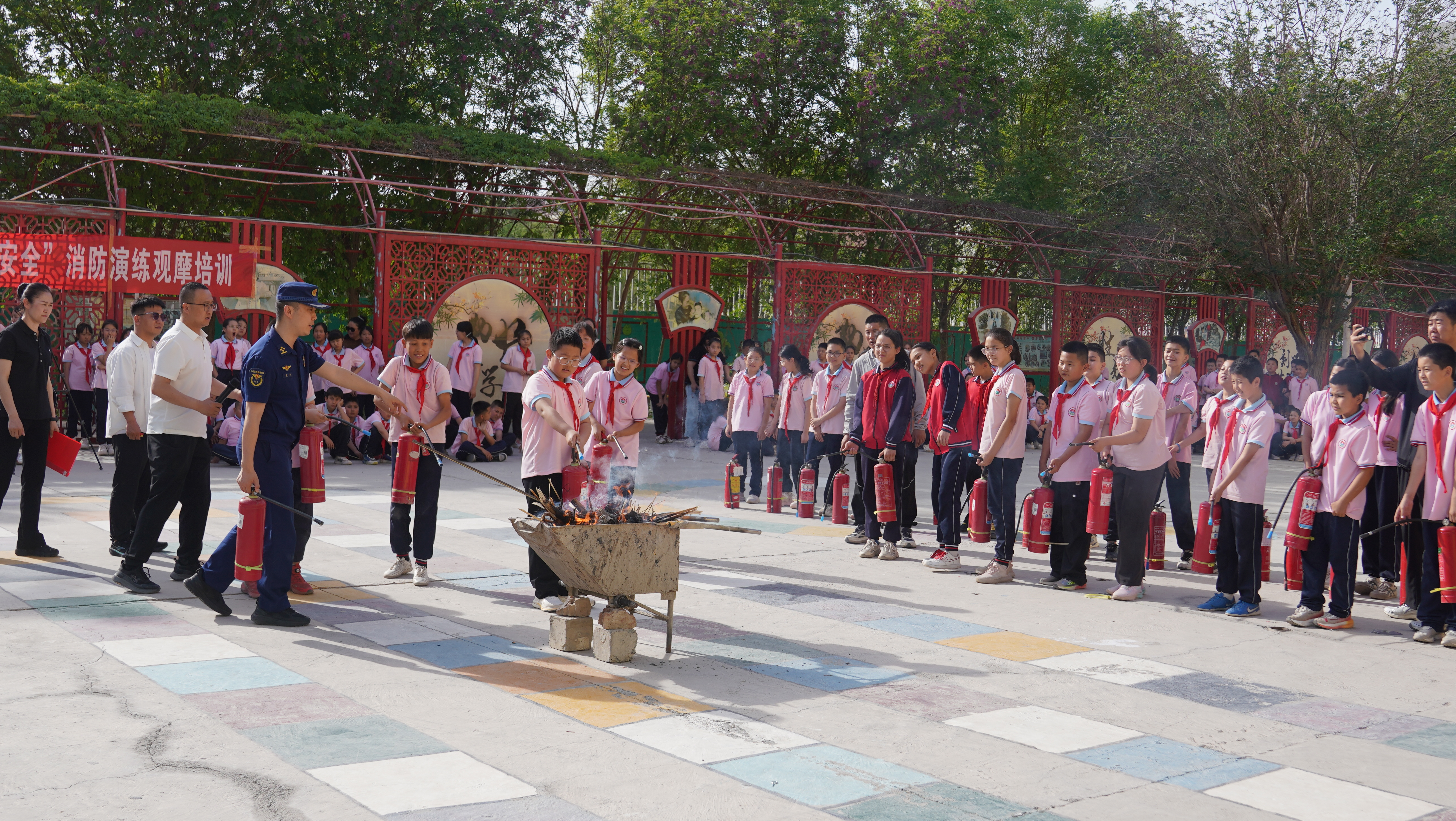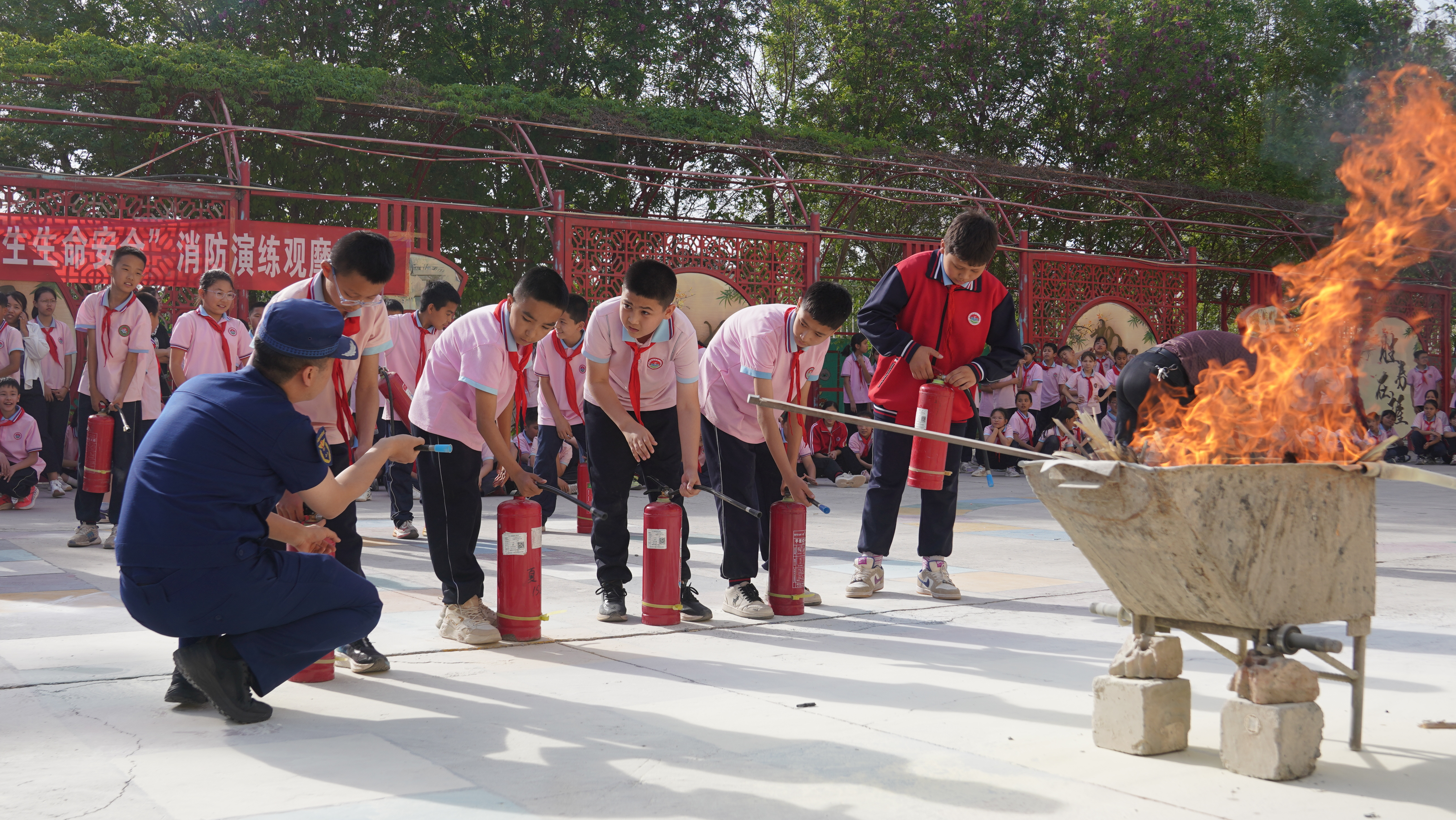 2026年4月15日,图为托克逊县消防救援大队为托克逊县第一小学学生讲解灭火器的使用方法。