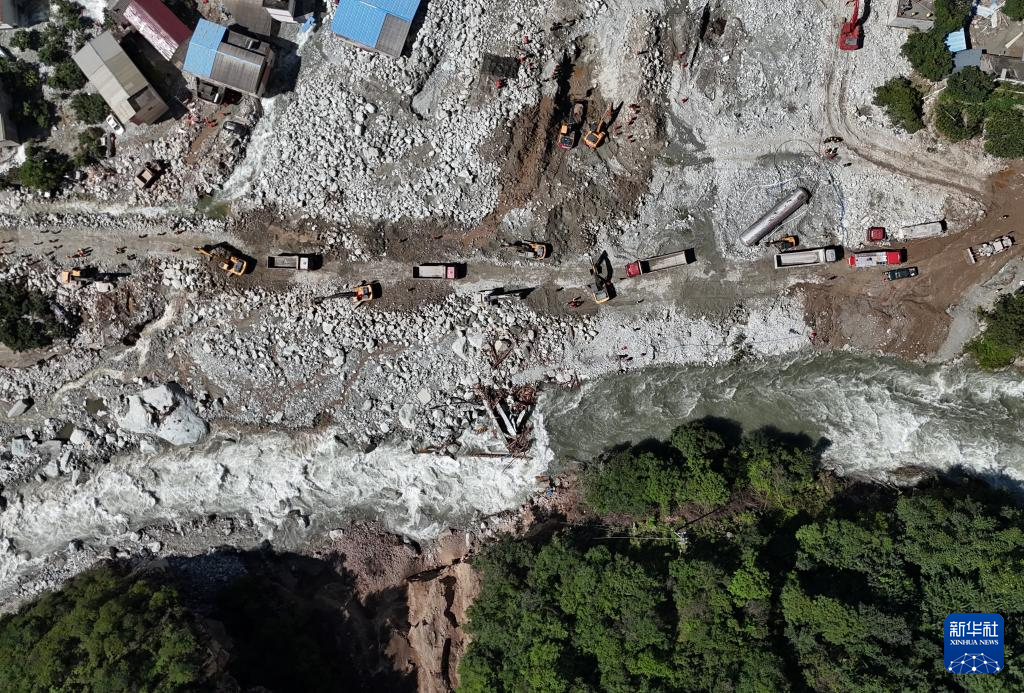 8月5日,在四川甘孜州康定市姑咱镇日地村,救援人员操作机械疏通国道318线(无人机照片)。