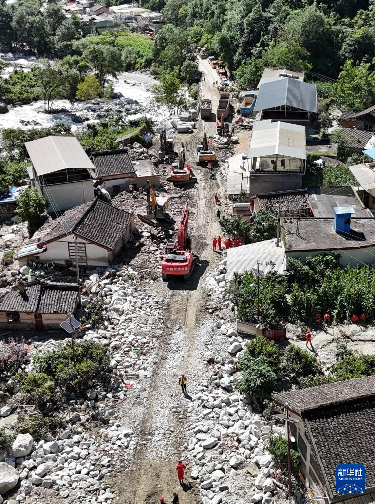 8月5日,在四川甘孜州康定市姑咱镇日地村,国道318线应急通道即将抢通(无人机照片)。