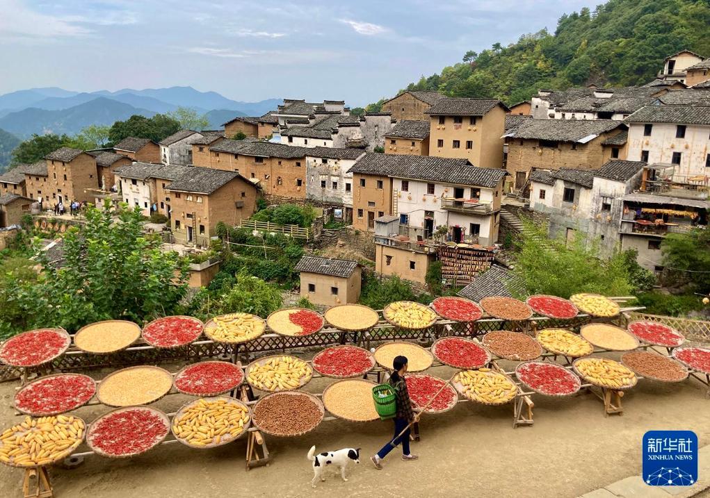 2022年9月23日在安徽黄山歙县阳产土楼拍摄的晒秋图景。新华社记者陈君清摄