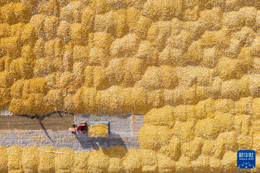 2023年10月19日,在黑龙江肇东五里明镇东升村,农民晾晒收获的玉米。新华社记者谢剑飞摄