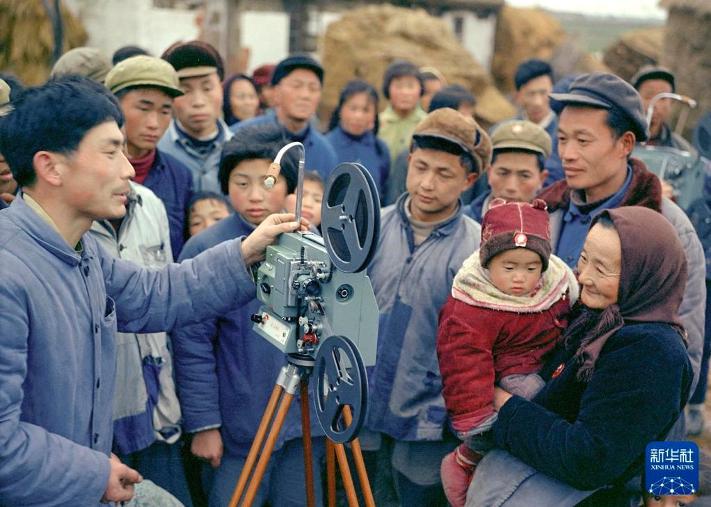 上海电影机械厂的工人携带8.75毫米放映机,向农民介绍机器的性能。(1969年5月20日发)新华社发