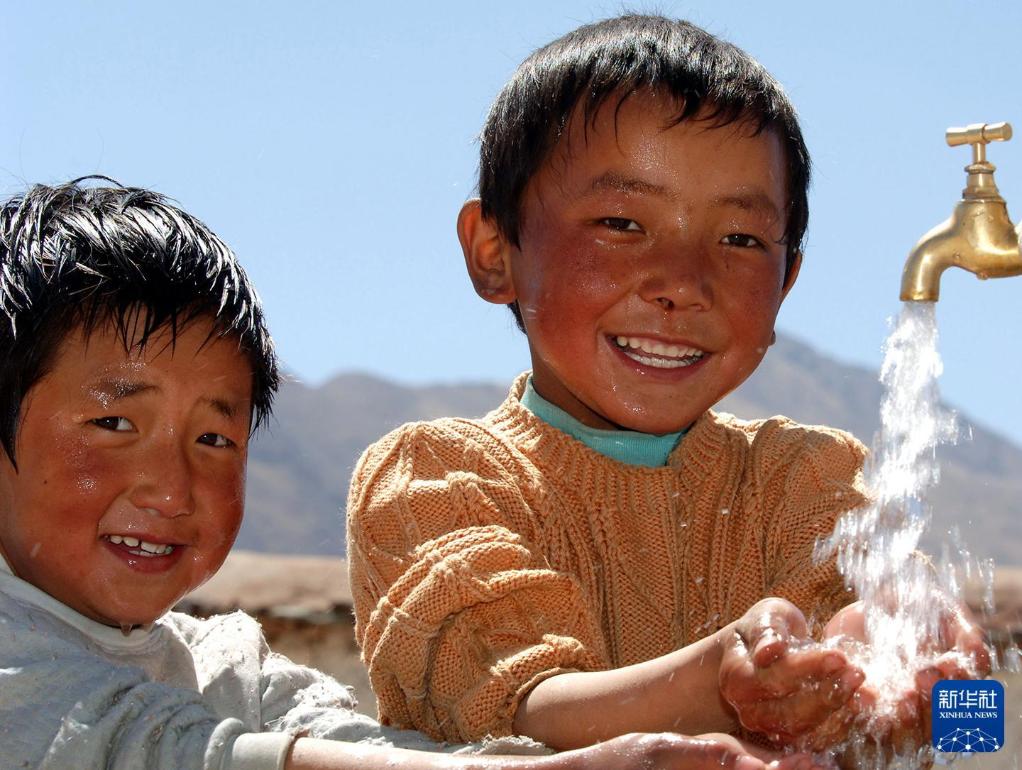 2006年4月9日,西藏达孜县朗热村的两名儿童用自来水洗脸。新华社记者格桑达瓦摄