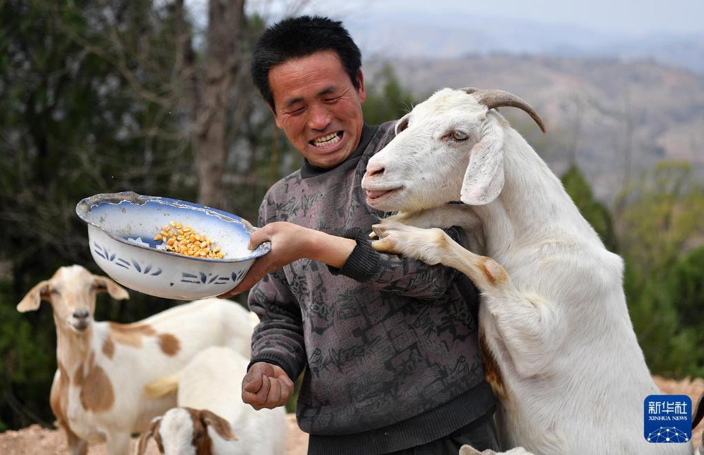 2019年3月27日,返乡创业的河南卢氏县沙河乡果角村村民任当锋在喂羊。新华社记者李嘉南摄