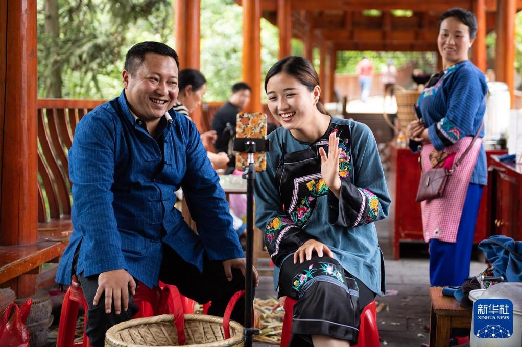 2020年5月15日,在湖南湘西十八洞村,扶贫队长麻辉煌(左)与返乡大学生施林娇(中)一起直播推销土特产。新华社记者陈思汗摄
