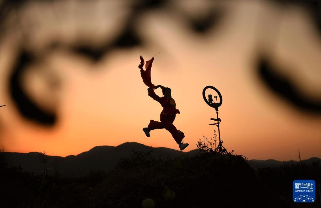 2020年10月17日,在山东淄博沂源县东里镇梅家坡村一处果园边,大学生王艺迪在夕阳下直播跳舞,为家乡的苹果“代言”。新华社发(赵东山摄)