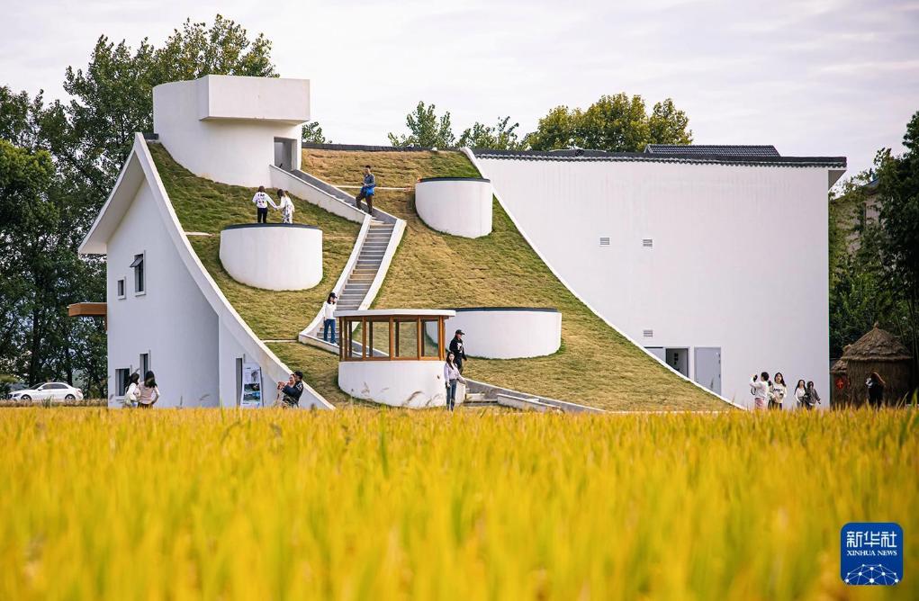 2022年10月25日在浙江桐庐县桐君街道梅蓉村拍摄的稻田与乡村会客厅。新华社记者江汉摄