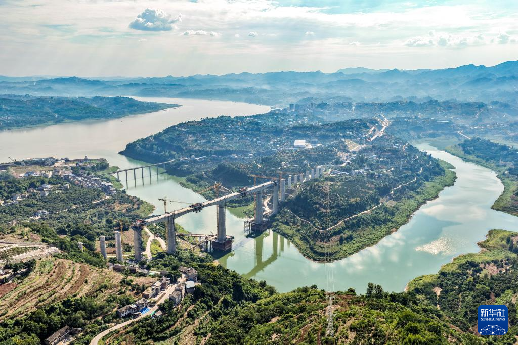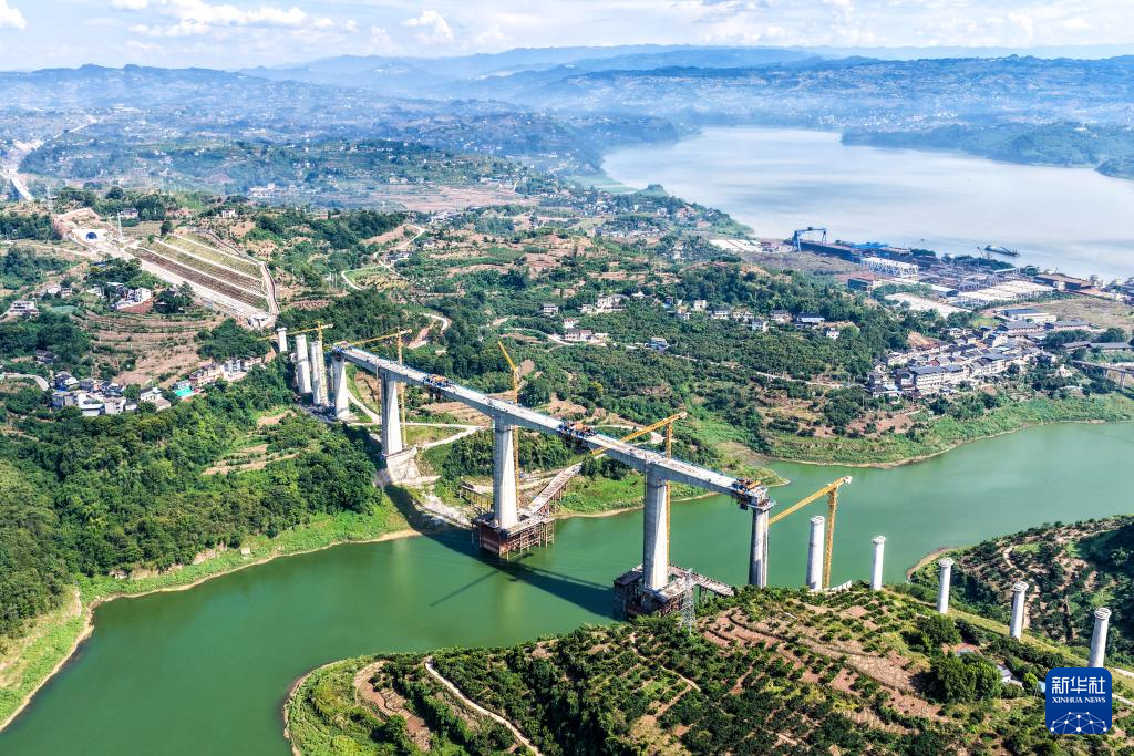 这是8月18日拍摄的渝万高铁渠溪河双线特大桥施工现场(无人机照片)。