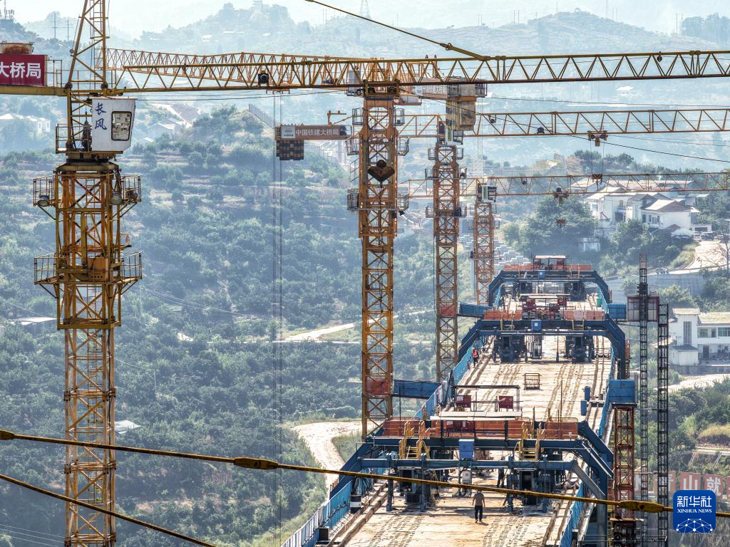 8月18日,工人在渝万高铁渠溪河双线大桥建设现场进行大桥合龙后的收尾作业。