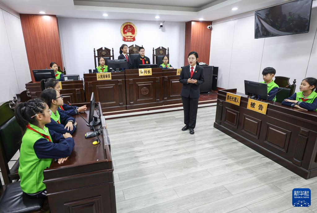 12月2日,在山东省荣成市人民法院民事审判庭,法院工作人员指导学生沉浸式体验“模拟法庭”。新华社发(李信君摄)