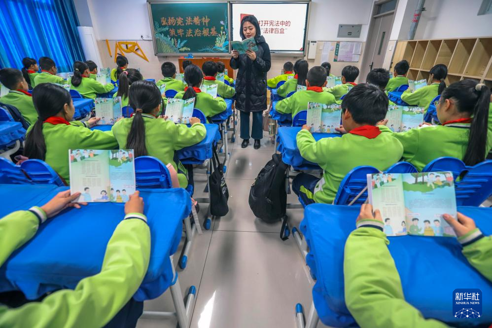 12月2日,在江苏省兴化市文峰小学,兴化市人民检察院未成年人法治宣讲团的工作人员为学生讲解宪法知识。新华社发(周社根摄)