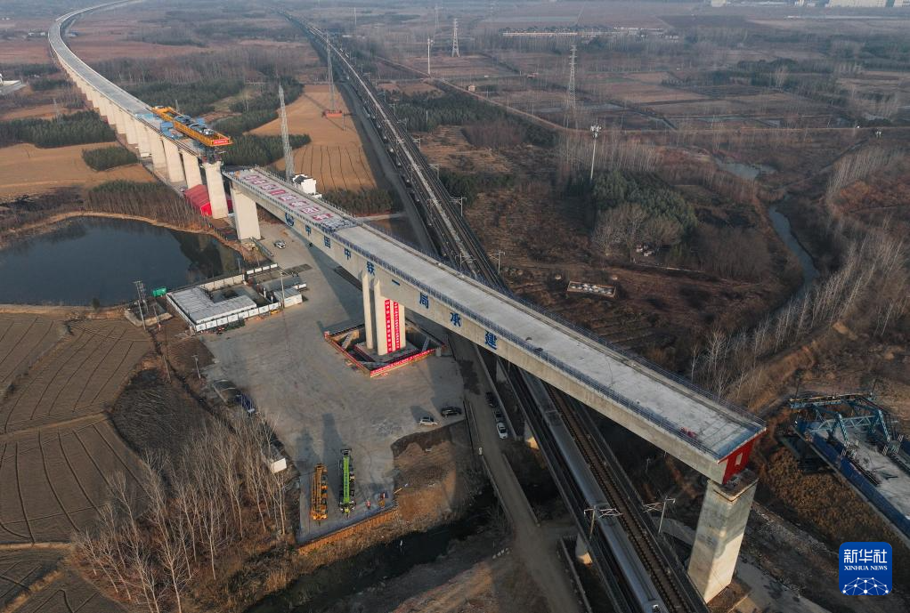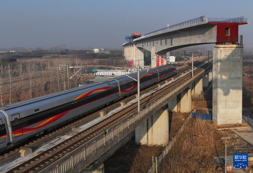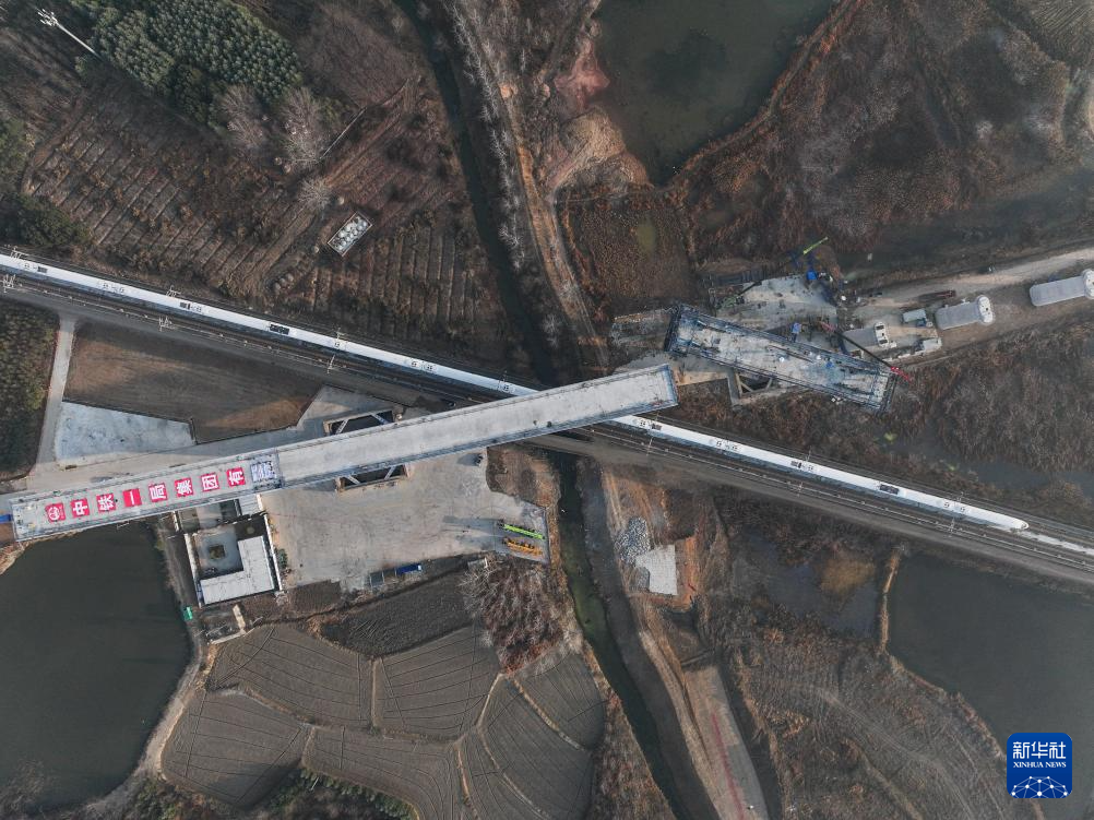 1月16日,行驶在京沪高铁线上的列车穿过沪宁合高铁跨京沪高铁立交特大桥201.5米预应力混凝土T构转体梁(无人机照片)。新华社记者 杜宇 摄