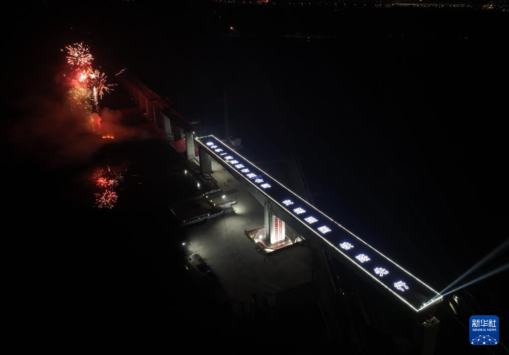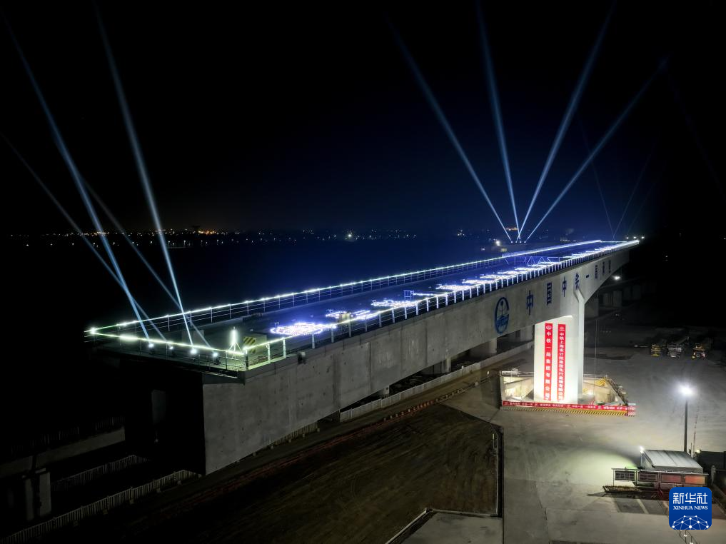 1月16日凌晨,沪宁合高铁跨京沪高铁立交特大桥201.5米预应力混凝土T构转体梁在转体施工中(无人机照片)。新华社记者 杜宇 摄