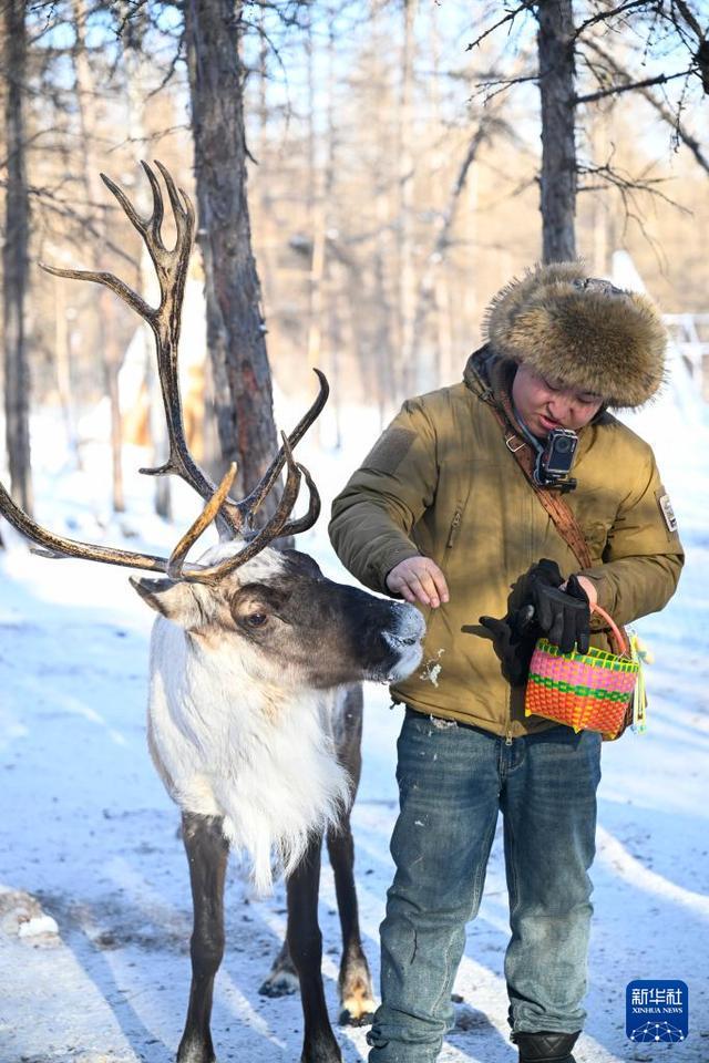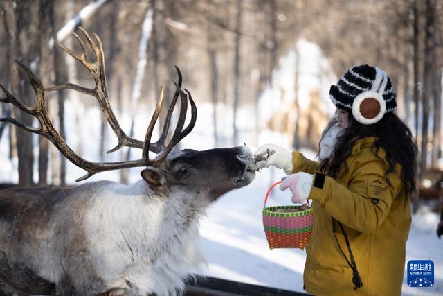 1月15日,游客在根河市敖鲁古雅鄂温克民族乡敖鲁古雅使鹿部落景区与驯鹿互动。新华社记者 徐嘉懿 摄