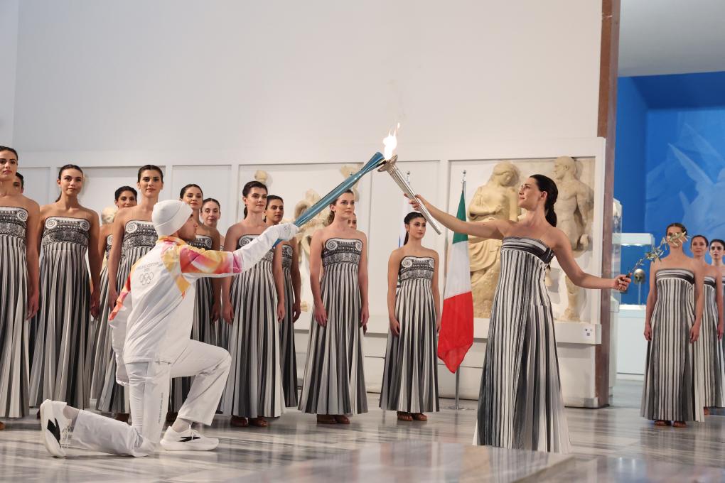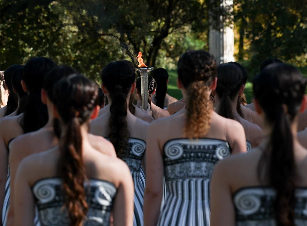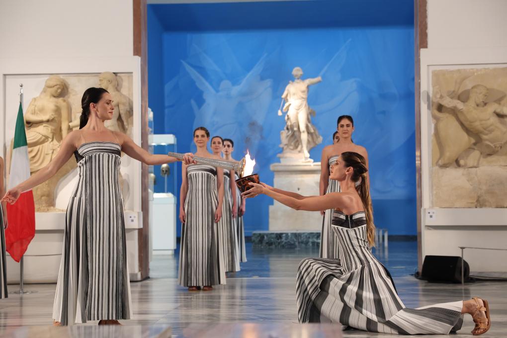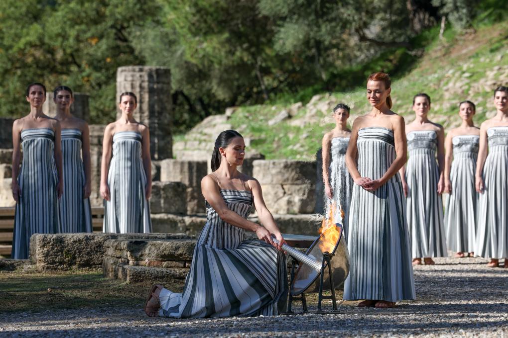 2024年4月16日,扮演最高女祭司的演员玛丽·米娜取得圣火。当日,2024年巴黎奥运会圣火火种采集仪式在希腊伯罗奔尼撒半岛的古奥林匹亚遗址举行。