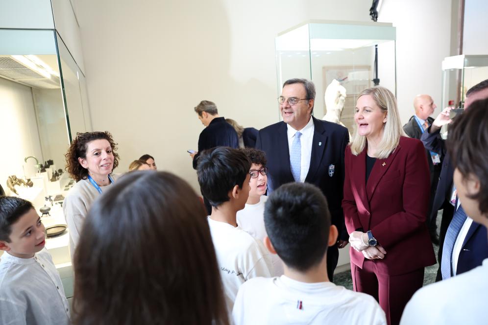 2025年11月26日,国际奥委会主席考文垂在仪式开始前与小演员互动。