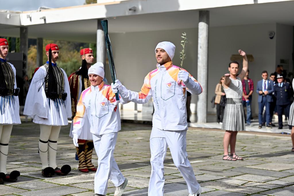 2025年11月26日,第一棒火炬手、希腊运动员彼得罗斯(左)与扮演最高女祭司的演员玛丽·米娜交接火炬。