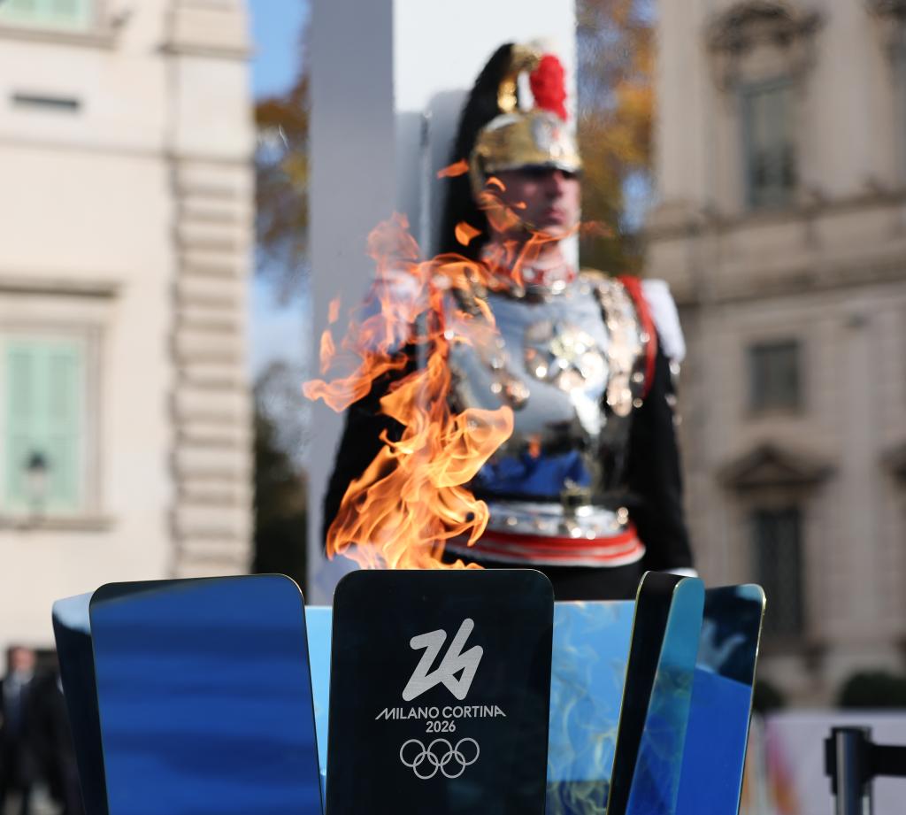 当日,2026年米兰-科尔蒂纳冬奥火炬接力庆典火盆点燃仪式在意大利罗马奎里纳莱宫广场举行。