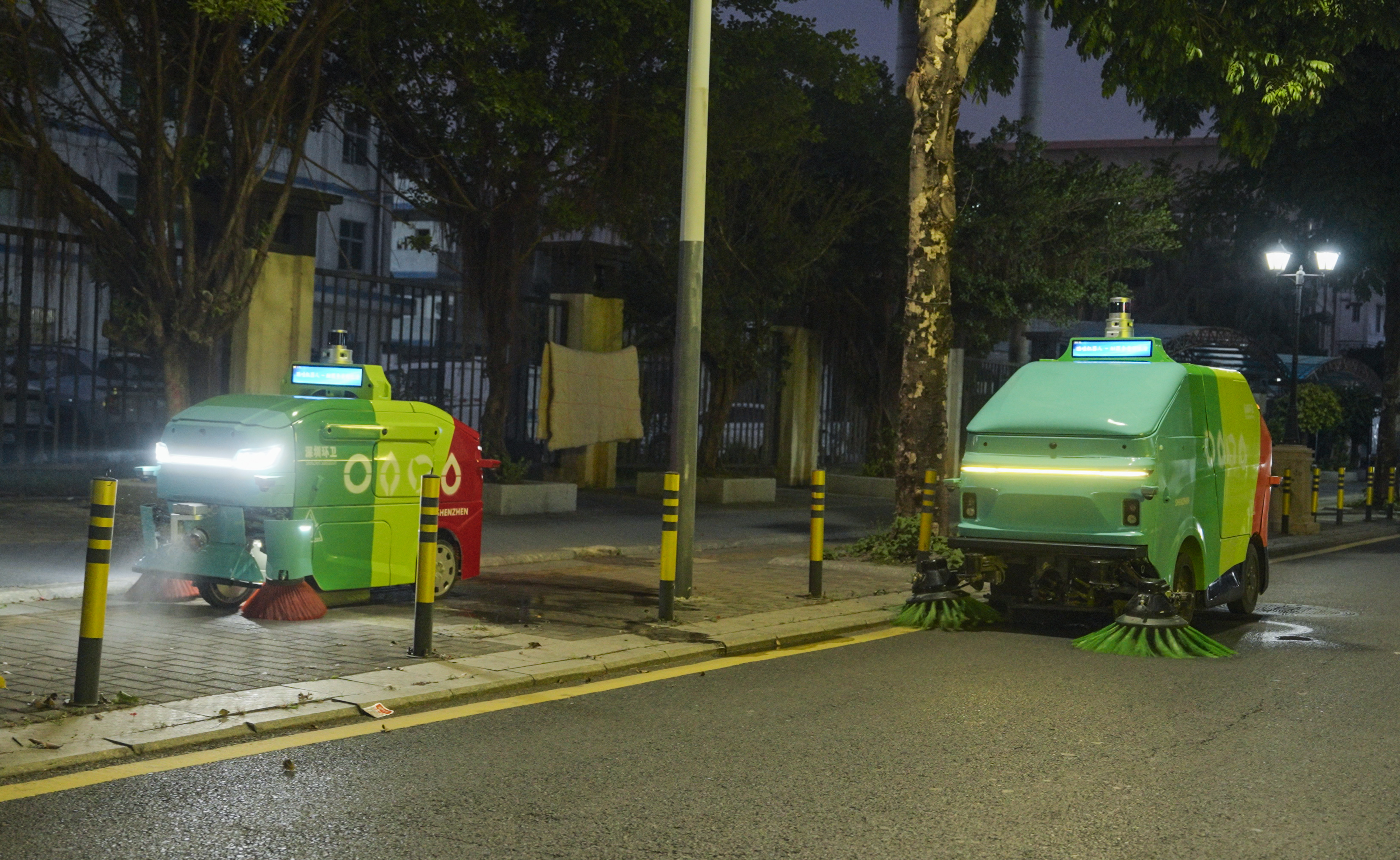 在深圳市坪山区石井街道,环卫机器人进行夜间协同作业(资料照片)。新华社发