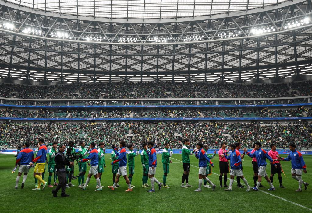 3月21日,在北京举行的2026赛季中国足球协会超级联赛第三轮比赛中,北京国安与上海申花的球员在赛前相互致意。新华社记者胡星宇摄