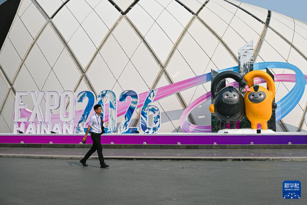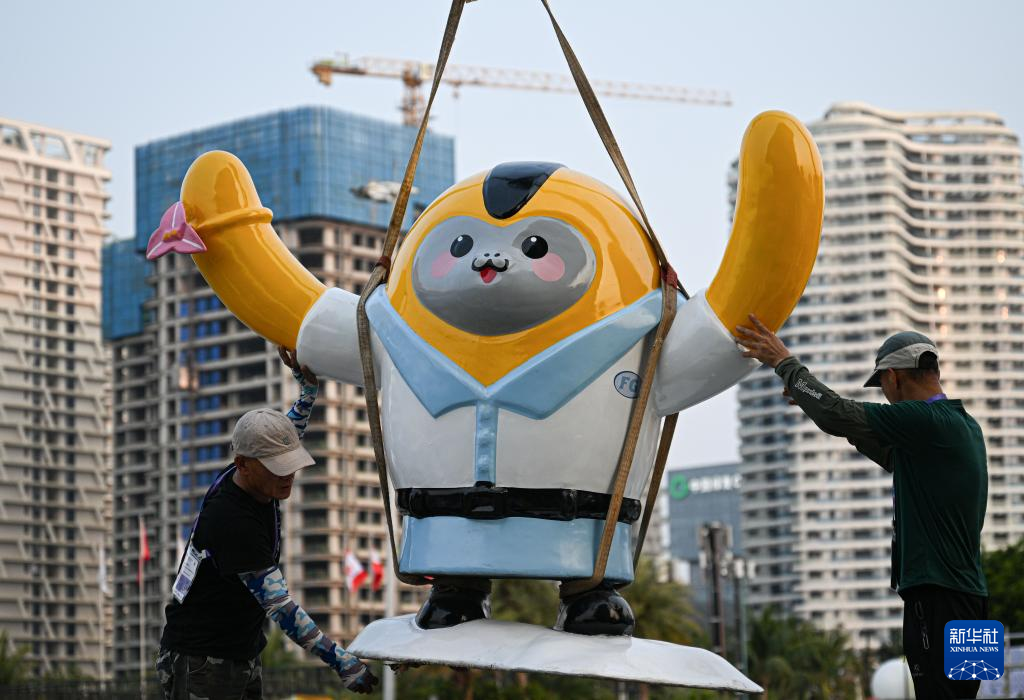 4月10日,工作人员在第六届消博会主会场外吊放消博会吉祥物。新华社记者蒲晓旭摄