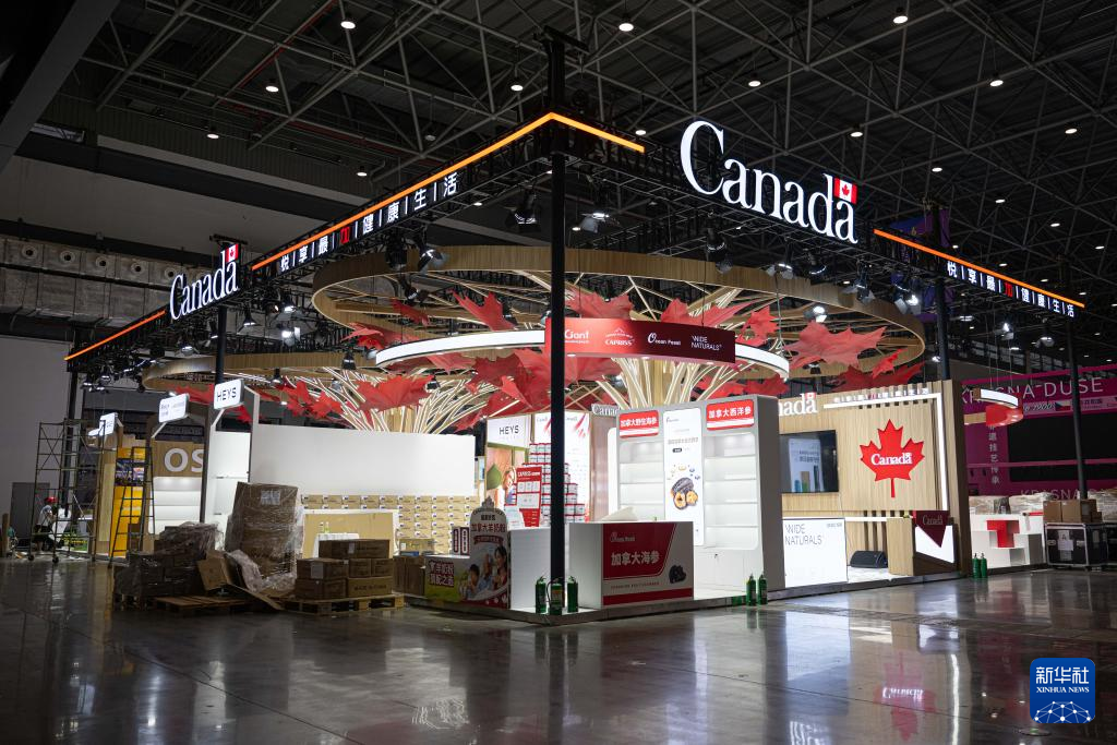 4月10日在第六届消博会主会场拍摄的布展中的加拿大国家馆。加拿大担任本届消博会主宾国。新华社记者蒲晓旭摄