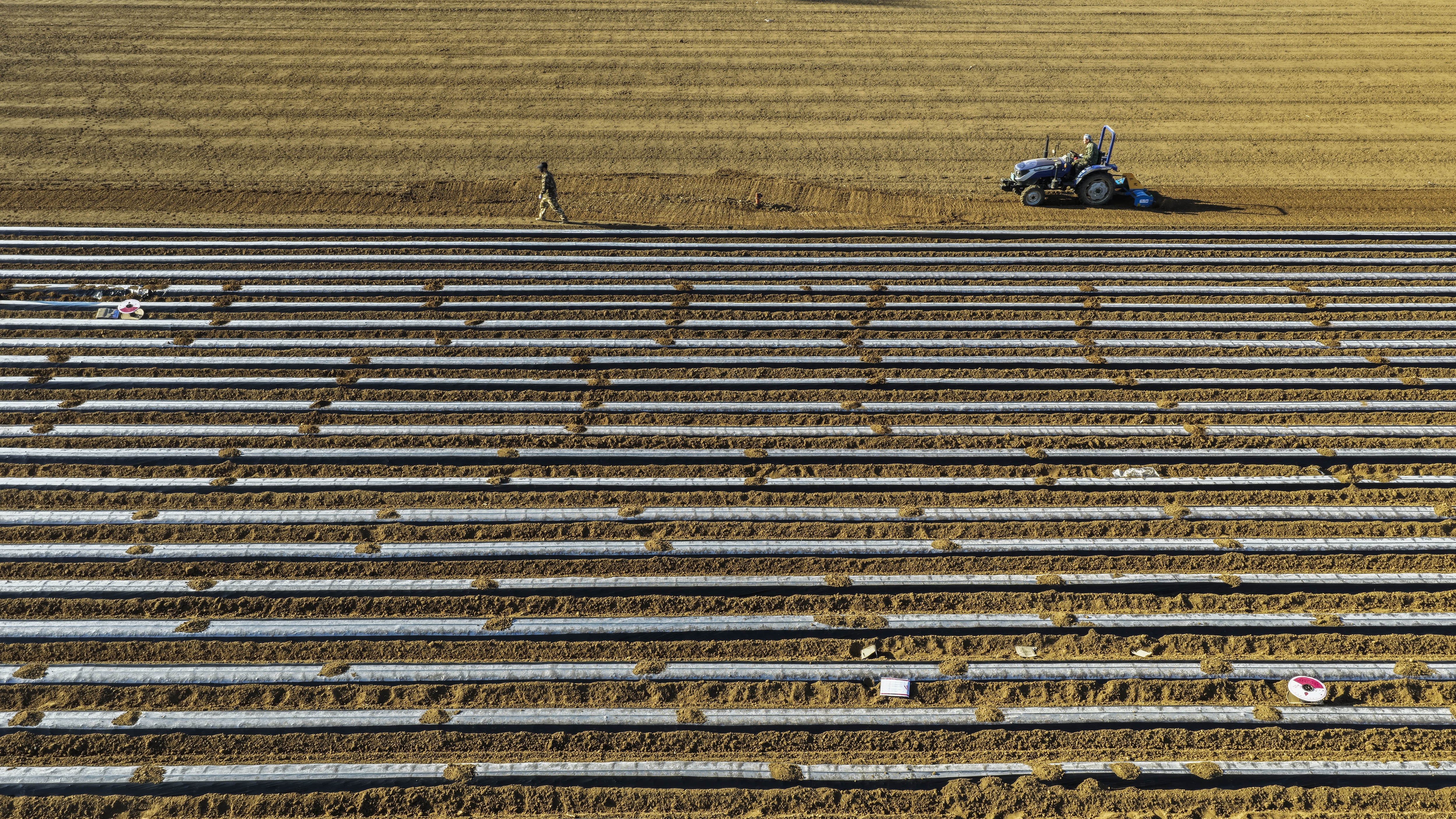 4月7日,河北省遵化市东新庄镇农民驾驶农机在田间耕作(无人机照片)。新华社发(刘满仓 摄)