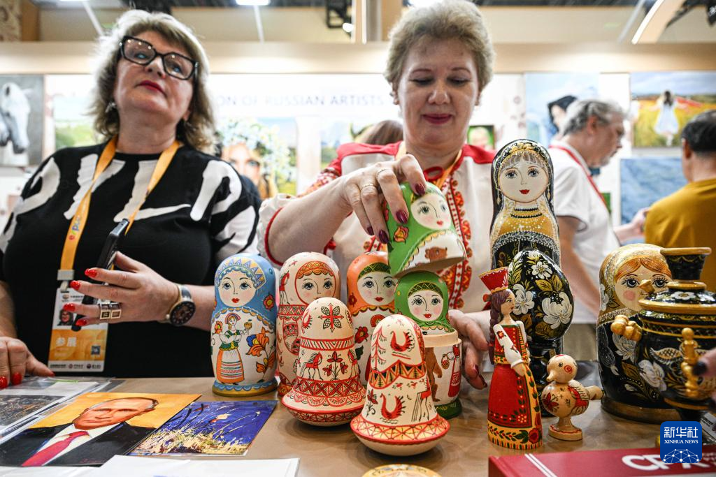 4月16日,参展商在第六届消博会现场展示俄罗斯工艺品。新华社记者 蒲晓旭 摄