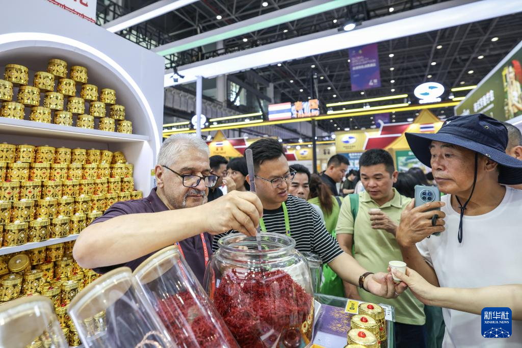 4月15日,观众在第六届消博会现场了解伊朗产品。新华社记者 张丽芸 摄