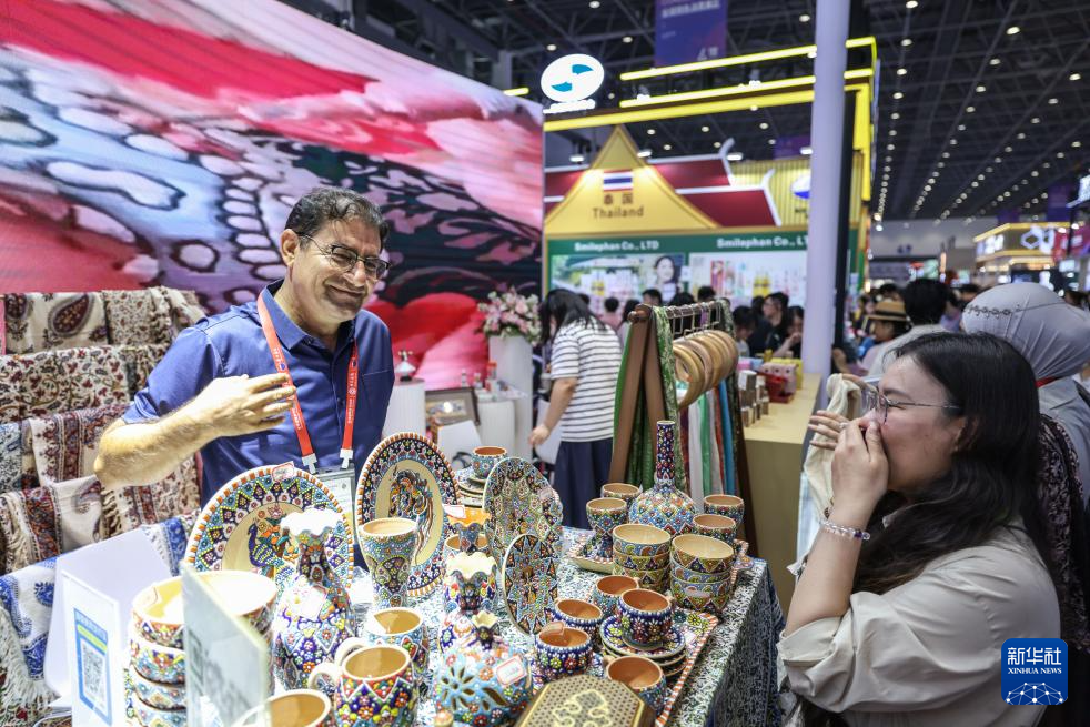 4月15日,观众在第六届消博会现场了解伊朗工艺品。新华社记者 张丽芸 摄