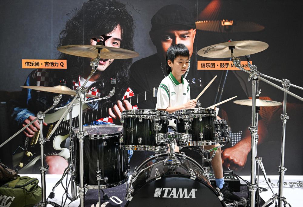4月18日,参观者在第六届消博会体验乐器。新华社记者 蒲晓旭 摄