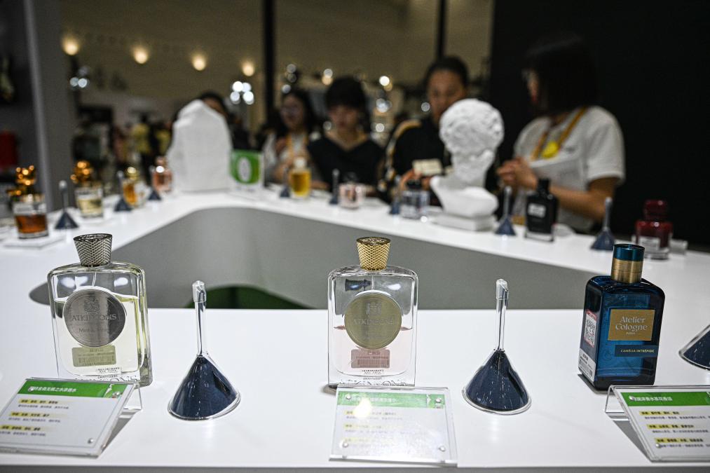 4月18日,参观者在第六届消博会国药国际展台选购香水。新华社记者 蒲晓旭 摄