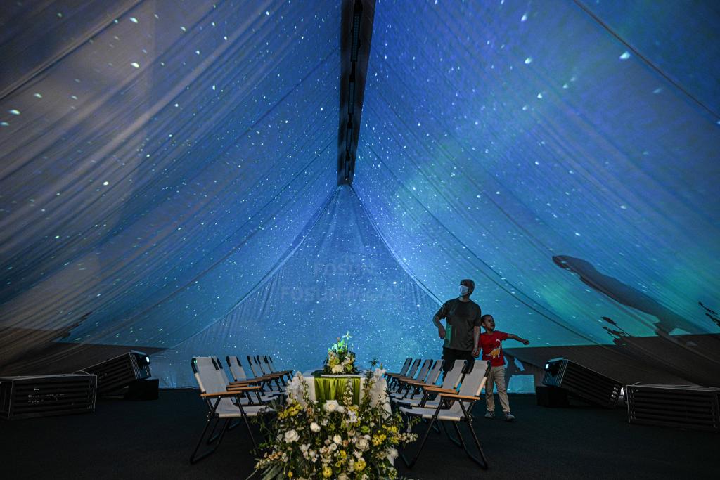 4月18日,参观者在第六届消博会复星展台感受沉浸式度假体验空间。新华社记者 蒲晓旭 摄