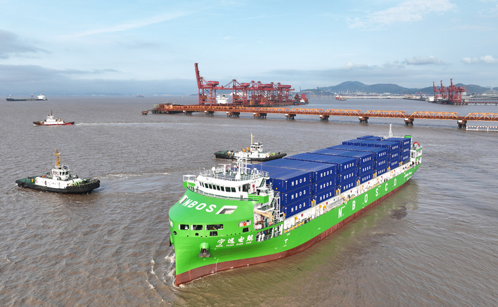 4月15日,全球最大、国内首艘万吨级纯电动智能集装箱海船“宁远电鲲”轮从宁波舟山港北仑港区启航,驶向嘉兴港乍浦港区,正式投入商业航线运营(无人机照片)。新华社发