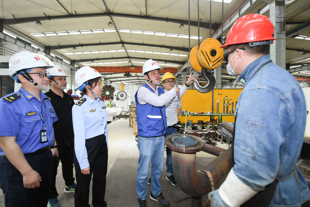 在浙江省湖州市吴兴区埭溪镇,由区、镇两级行政执法人员组成的综合行政执法队在企业厂房进行“综合查一次”协同检查(2022年5月25日摄)。新华社记者翁忻旸摄