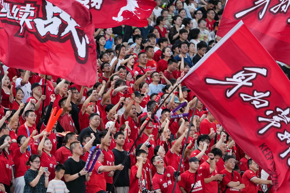 2025年7月20日,2025江苏省城市足球联赛第七轮比赛中,常州队球迷在场边加油。新华社记者 李博 摄