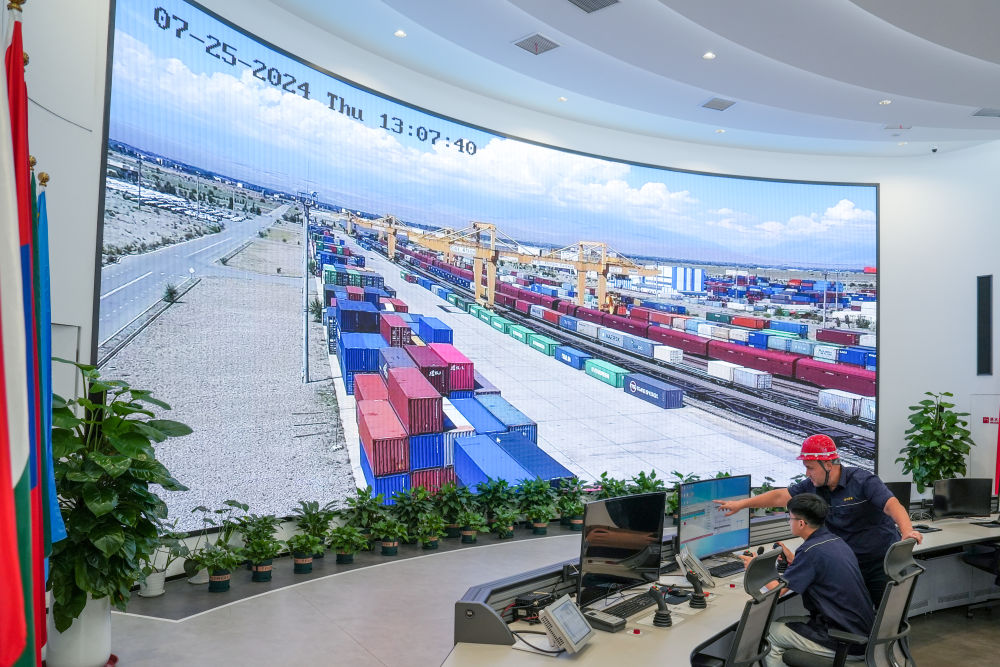 △ 2024年7月25日,在中哈(连云港)物流合作基地,工作人员通过“中哈物流场站”信息化跟踪系统查看集装箱运输情况。