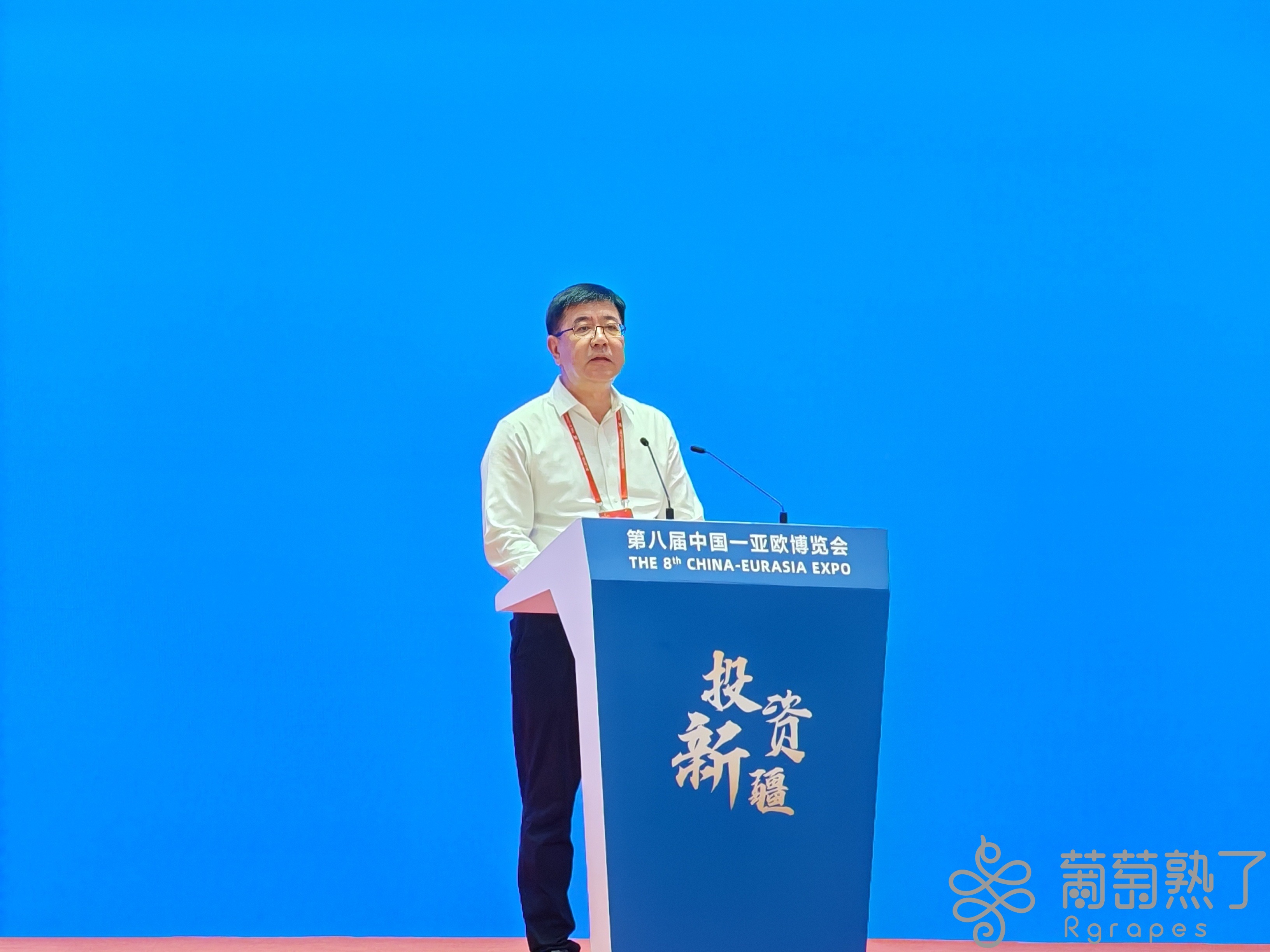 图为市委副书记、市长克衣色尔·克尤木代表吐鲁番市在第八届中国—亚欧博览会投资新疆产业合作推介对接暨签约活动上作产业合作推介。葡萄熟了/吐鲁番市融媒体中心记者 彭丹妮 摄