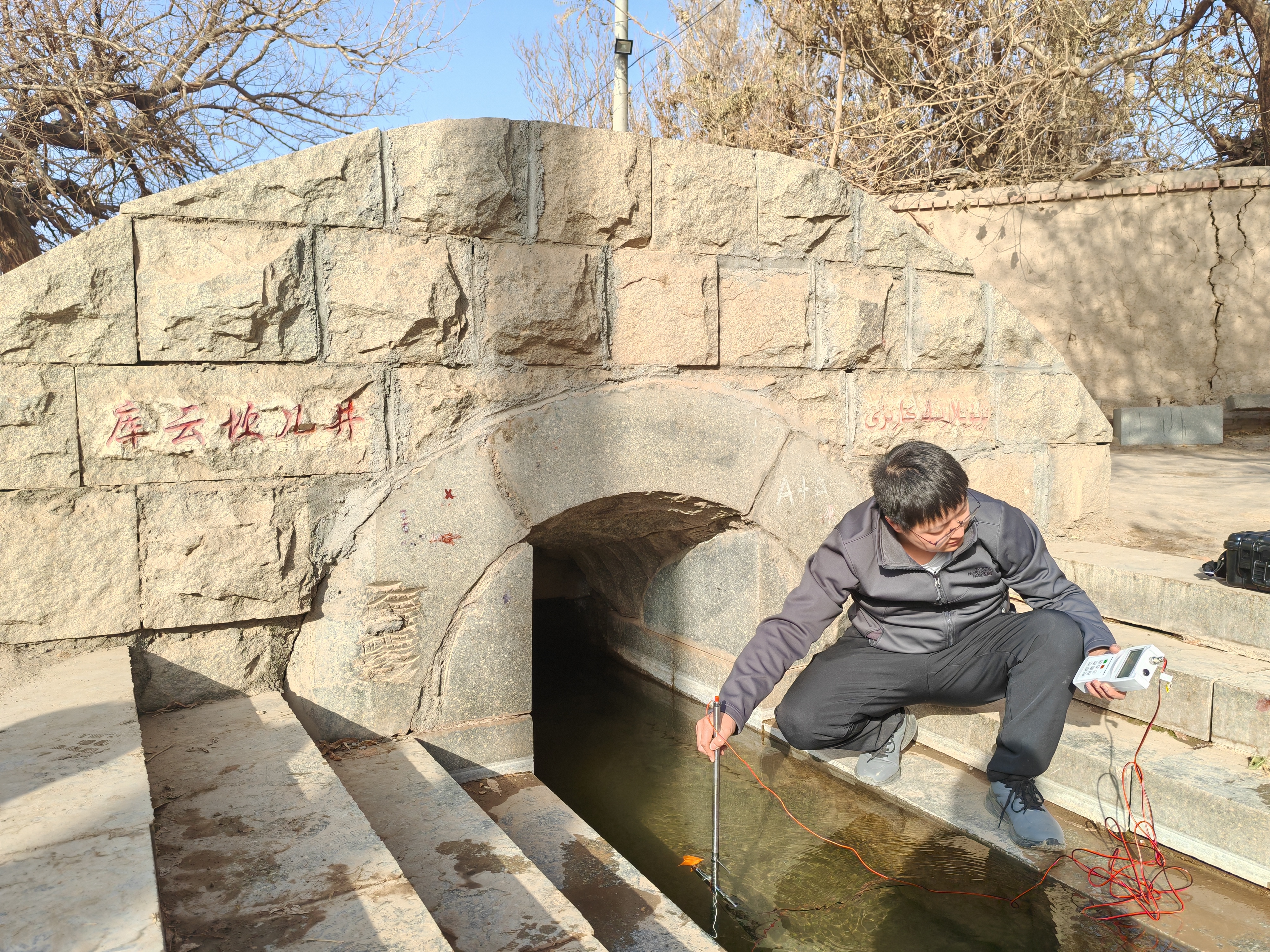 赵鹏博正在监测坎儿井流速。吐鲁番市融媒体中心记者 彭丹妮 摄