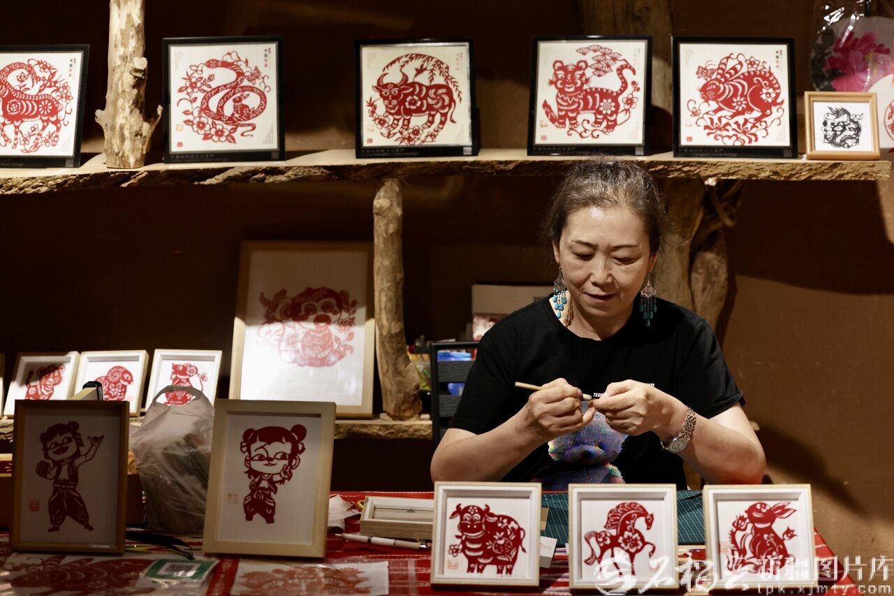 9月9日,吐峪沟景区非遗街区非遗代表性传承人正在剪纸。