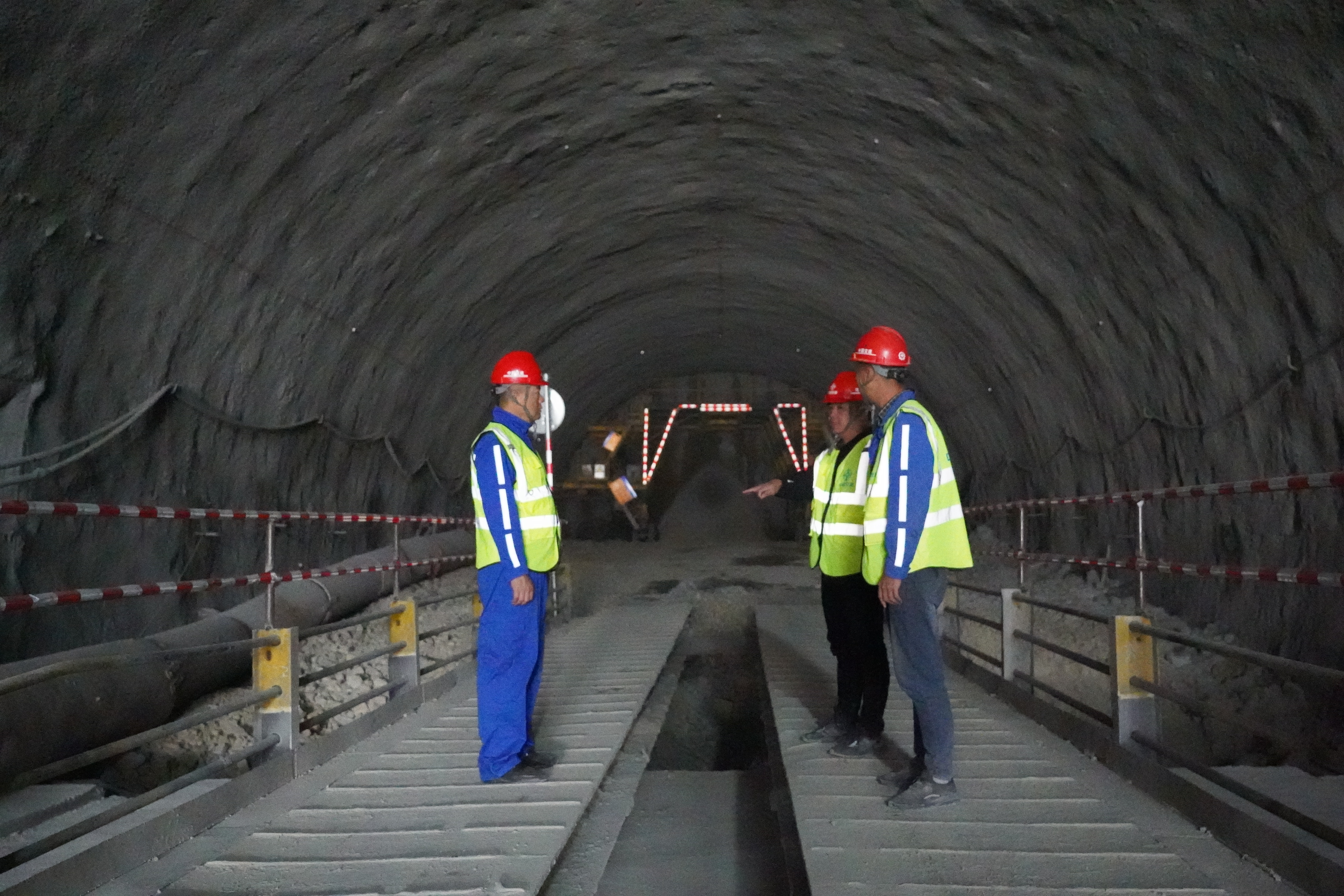 在五标段阿拉沟1号隧道内,工作人员正在检查现场施工情况。吐鲁番市融媒体中心通讯员 高双强 摄