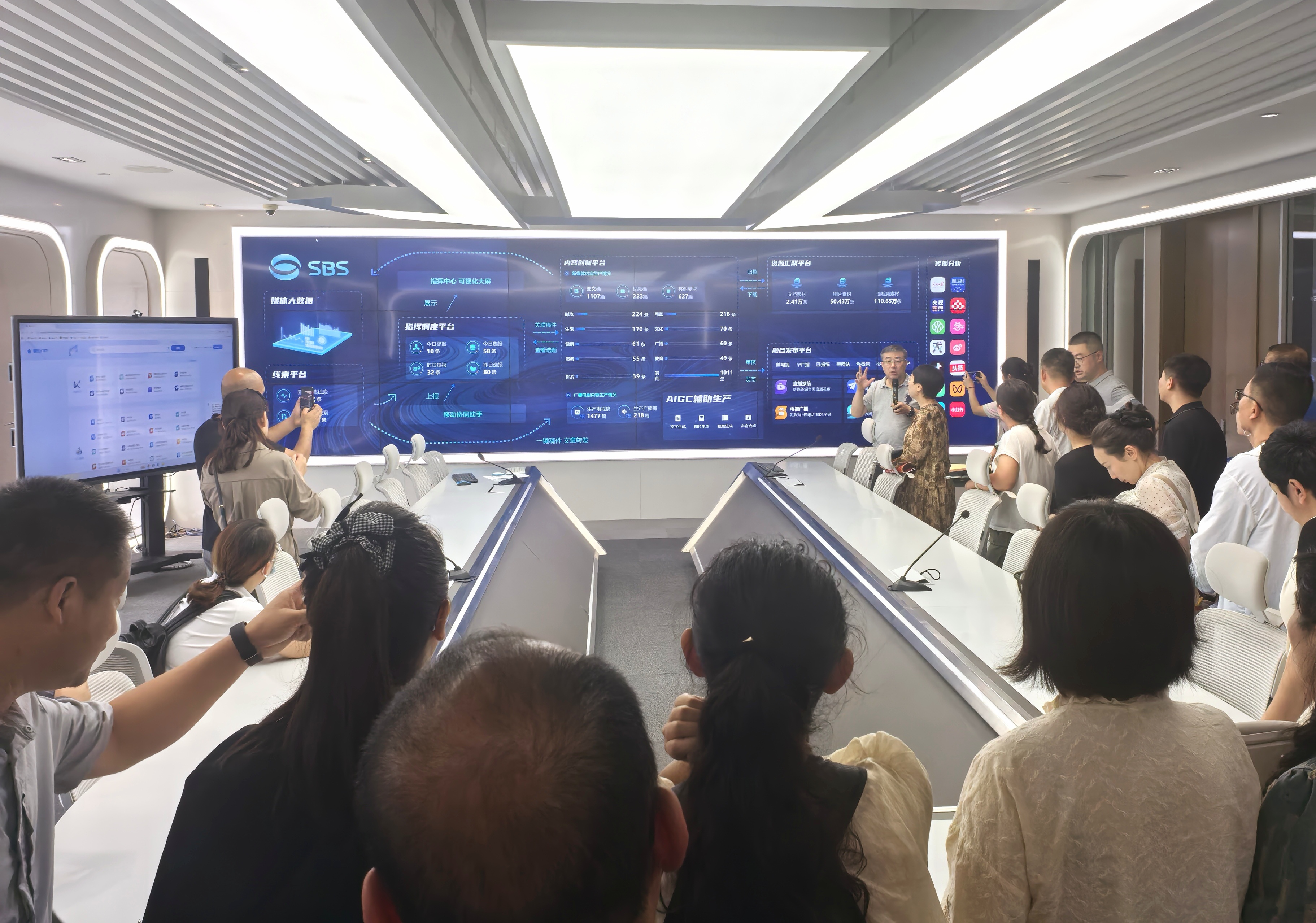 随后,代表团参观了集信息采集、内容监控与调度指挥于一体的全媒体指挥中心。该中心配备了先进的智能感知系统,能够以每3至5分钟一次的频率自动抓取全网热点信息,实现对舆论动态的高效感知与实时追踪。苏州广播电视总台相关负责人现场演示了多项基于AIGC(生成式人工智能)的智慧媒体应用,包括AI视频自动剪辑、智能媒资平台管理以及内容一键多平台分发等功能,全面展示了人工智能技术在媒体内容生产、资源集约化管理和多渠道高效分发中的深度融合与创新突破。