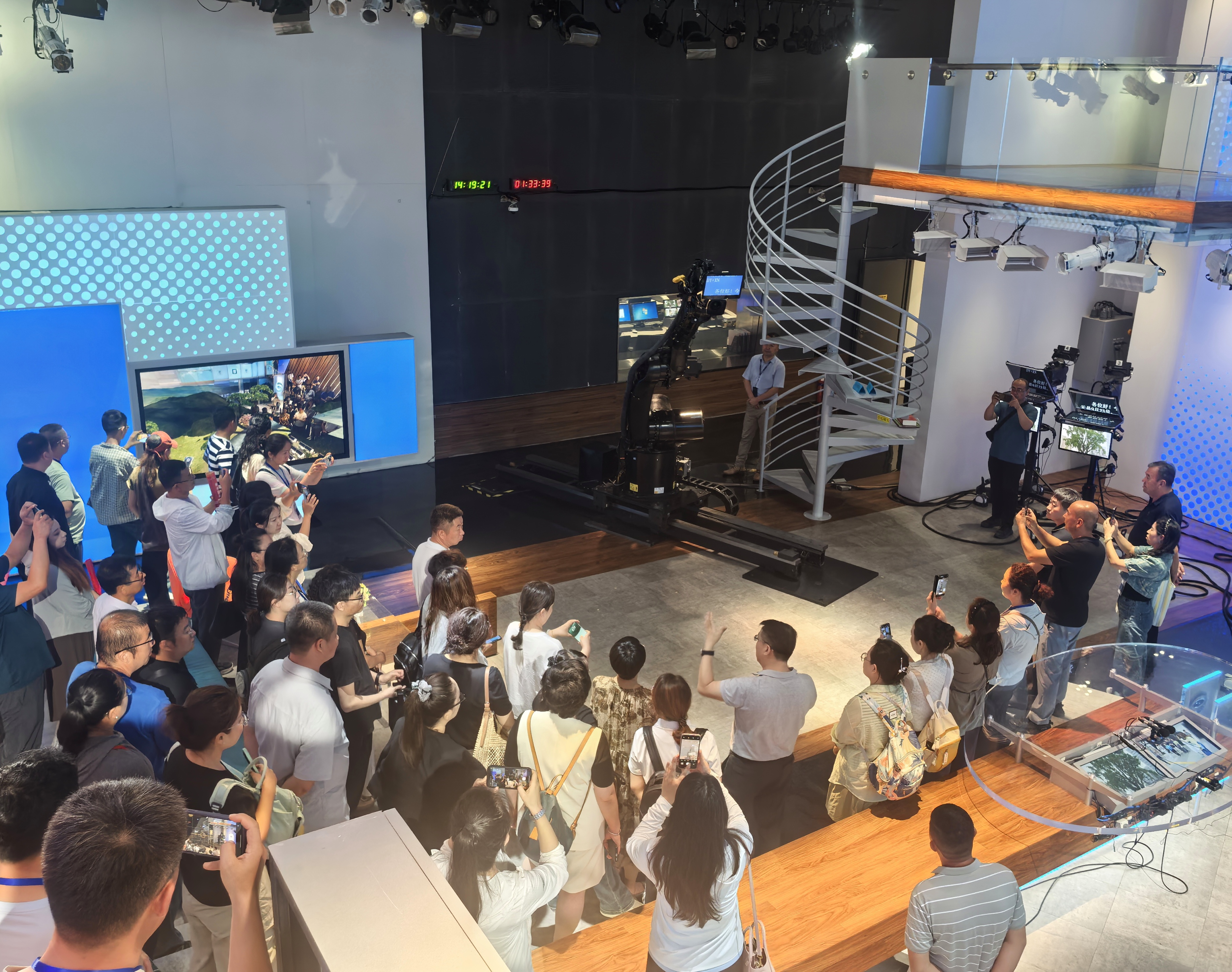 参访期间,代表团一行重点考察了苏州广播电视总台在智能化演播、内容生产创新和全媒体运营管理等领域的实践成果,体验了技术驱动下媒体融合的前沿应用场景。在XR星梦演播室,代表们观摩了全地形特拍机器人的实际应用。据介绍,通过智能化控制系统,一名操作员可同时操控五台摄像机完成常规节目拍摄,这一创新模式不仅显著提升制作效率,也大幅降低了人力成本。代表团成员现场体验了XR实时拍摄渲染技术,感受虚实融合的沉浸式节目制作流程。