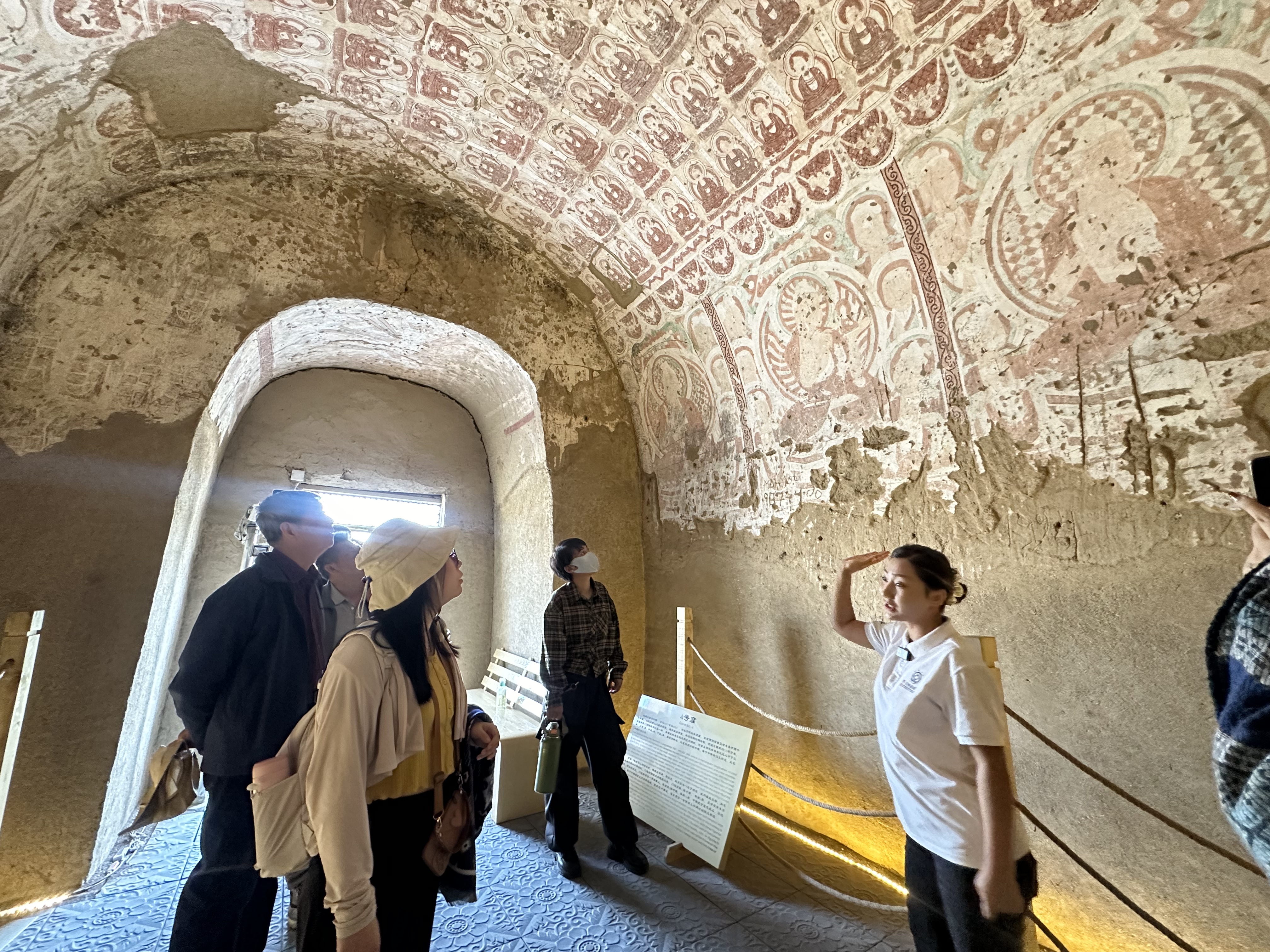 讲解员在雅尔湖石窟为游客讲解。吐鲁番市融媒体中心 记者 阿地兰 摄
